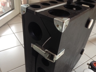 Für den Transport können die Höhenräder, die Spiegelbox und etwas Zubehör in der Kiste, bestehend aus Basis und umgedrehter