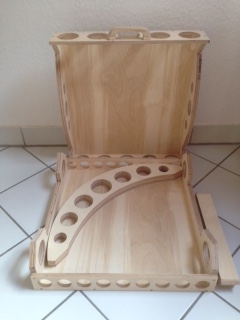 passend zum "Silber" der Stangen und Beschläge. Der Deckel der Holzkiste dient als Basis, auf dem Deckel sind drei Gleitlager