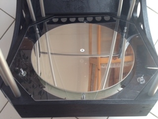 Die Spiegelbox besteht aus einer 15mm dicken Grundplatte mit kreisförmigem Ausschnitt, in welchem der Spiegel liegt. Gelagert