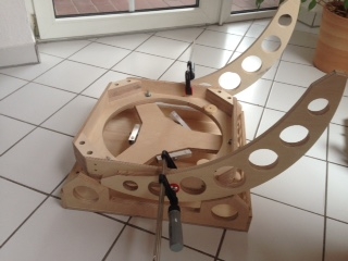 Die Abbildung links zeigt die Holzteile, wie sie von Astro-Optik Martini geliefert wurden, präzise gefräst und nur noch