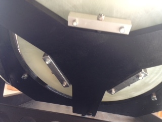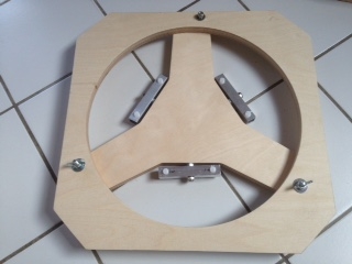 ist der Spiegel auf einer sternförmigen Basis mit Alu-Wippen, in welche je zwei Polymerschrauben eingeschraubt sind, auf deren