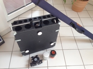 einem Köcher aus dem Angelzubehör (Rutenköcher) verstaut. Der Okularauszug, der Paracorr und der Fangspiegel müssen separat