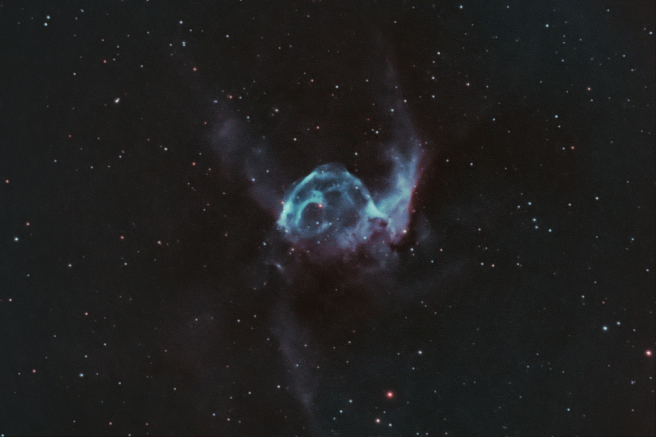 Mommenheim, 12.02.22; C8 f/7, HEQ5 Pro mit Guiding, Ha(7nm) 20x180s, OIII(7nm) 20x180s, gesamt: 2h, Bildbearbeitung: DSS, Affinity, künstlicher Blaukanal aus OIII, keine Darks und Flats, leichter Crop, 3/4 Mond in der Nähe