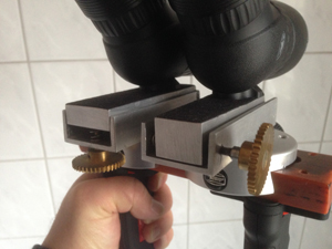Mit zwei an der Prismenschiene montierten Handgriffen aus dem Kamerabedarf, lässt sich der Doppelkolibri bequem freihändig