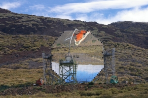 durch Gamma-Strahlung in der Hochatmosphäre induzierte Cherenkov-Strahlung detektieren und in dessen Spiegel sich
