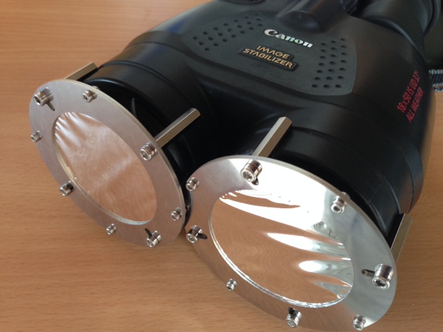 Hier sind zwei fertig montierte Sonnenfilter auf meinem Canon 18x50 IS gezeigt. Dadurch, dass der Abstand der beiden